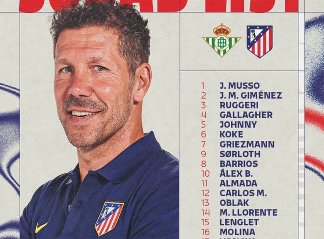 马竞客战贝蒂斯大名单:格列兹曼、小蜘蛛领衔,卡多索回归